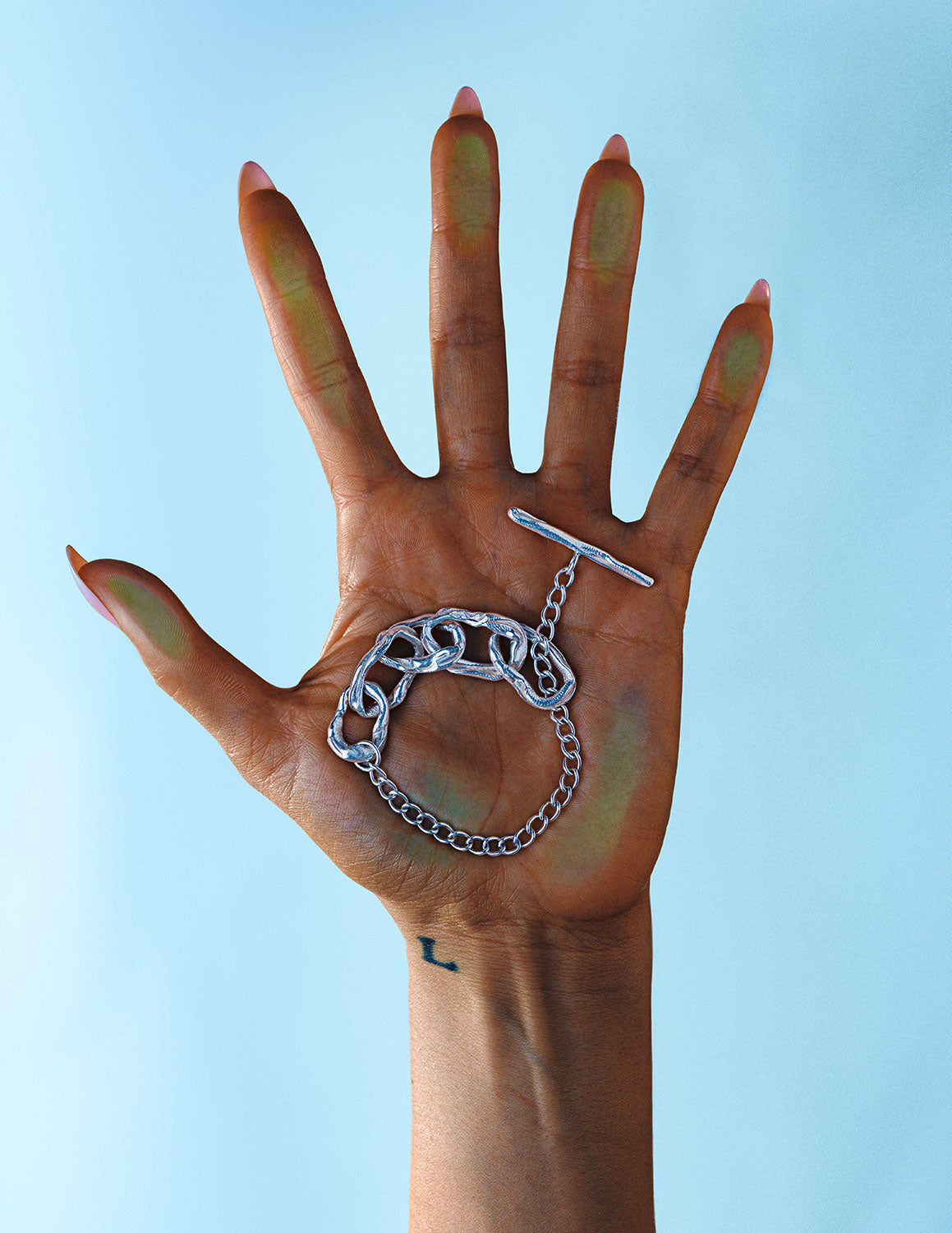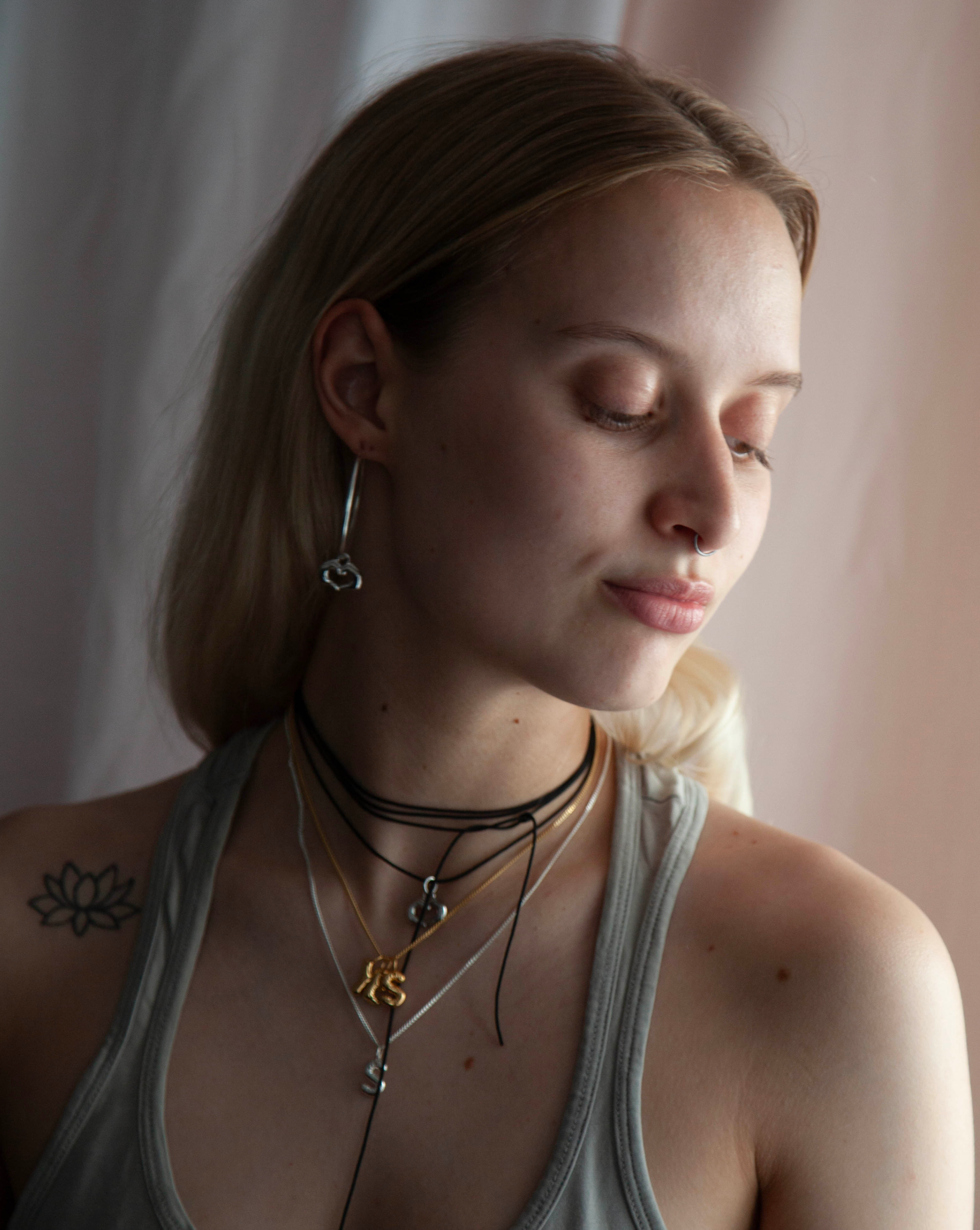 The LILY collection is an attempt at turning the childhood fascination of the intricate patterns made by rain running down the window or hitting the ground, intosolid shapes adorning the ear and hand.
