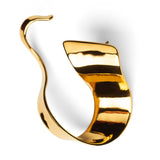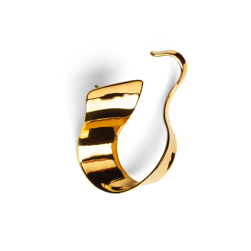 This meticulously crafted earring in 18 kt goldplated silver is a key piece in our collection and already a classic worn by young and old. The way it sensually ripples around the ear makes it appear weightless, while it actually is resting 2 places on the ear - with a classic stud and with a hook resting in the concha of the ear. The movement of the earring is inspired by raindrops and the way they flow before forming a puddle.