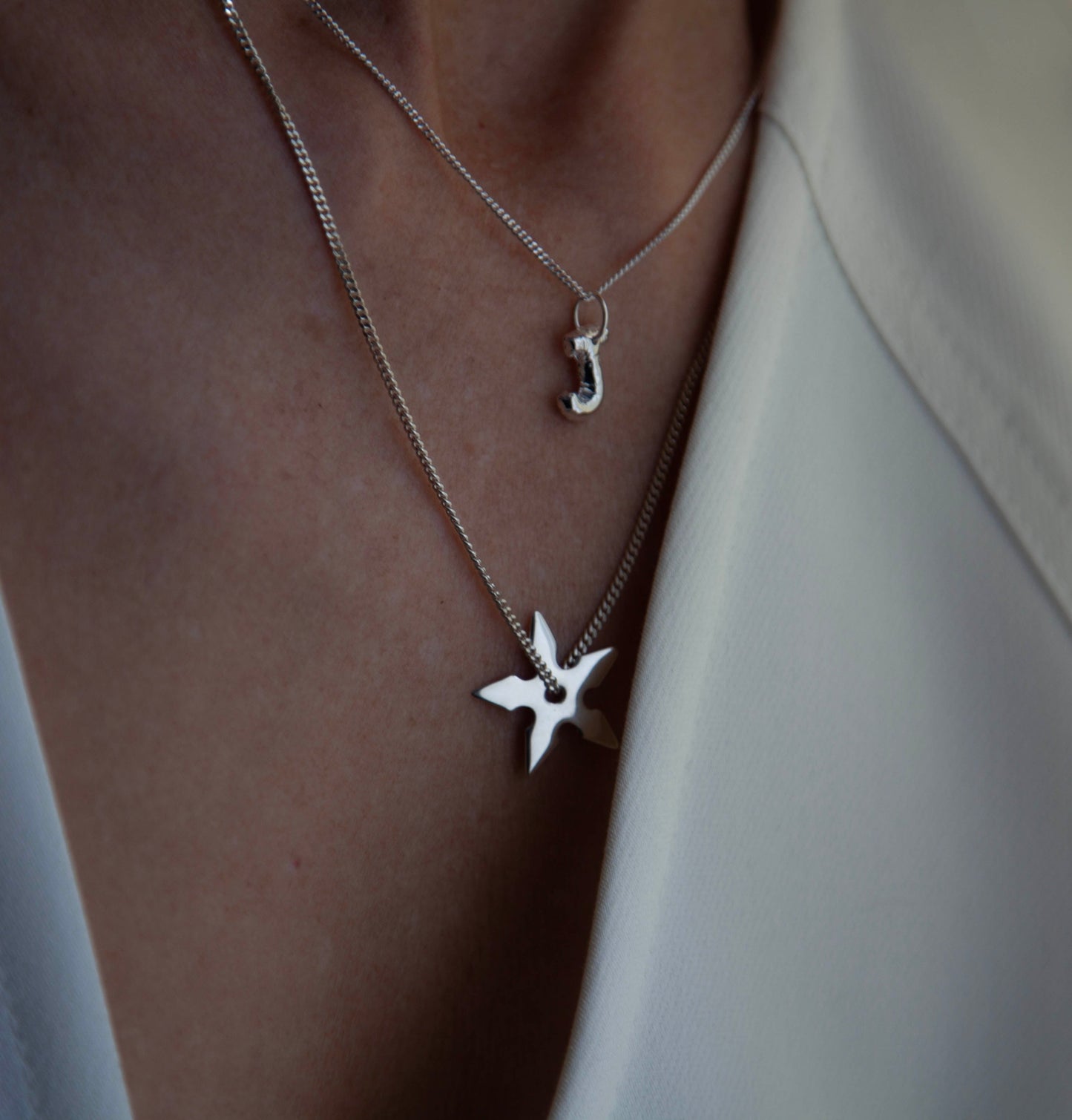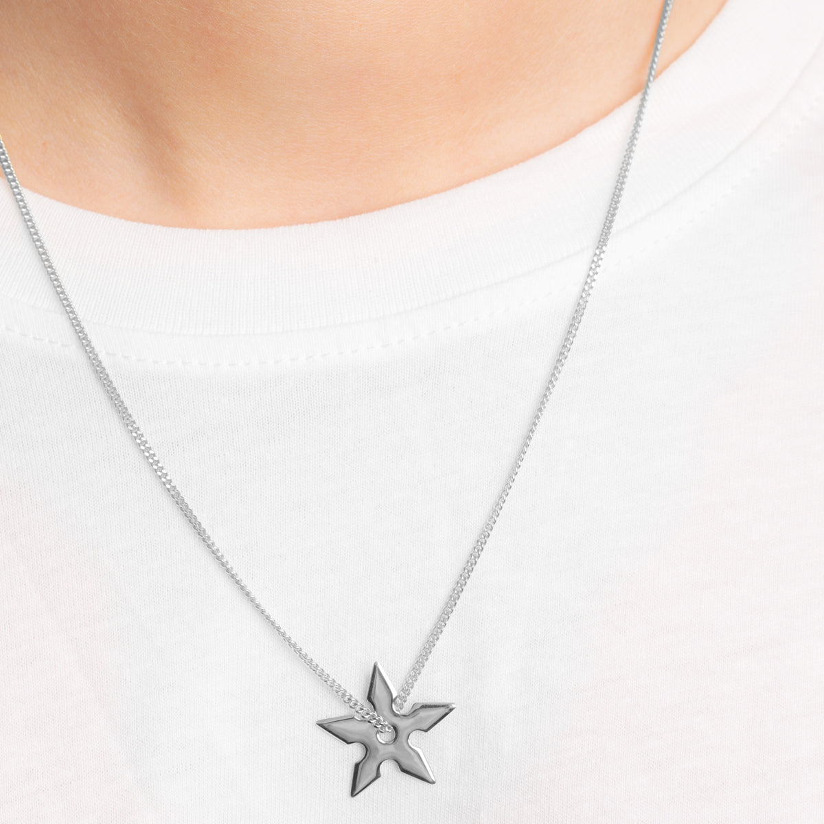The inspiration for this unisex necklace in sterling silver is the Japanese throwing star and in this version, an attempt to twist the shuriken into our spin on a common star-pendant. But most important it is a cool, sophisticated silver pendant that will adorn everyone regardless age and gender but who appreciates clean, beautiful craft and longevity in a design.