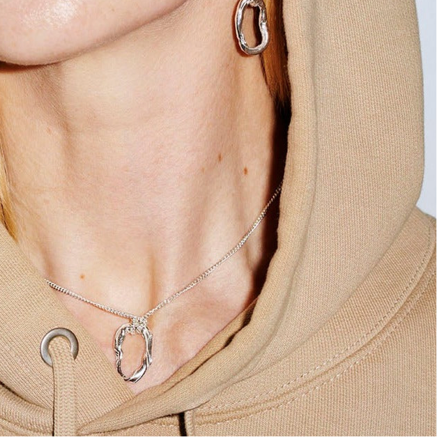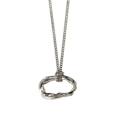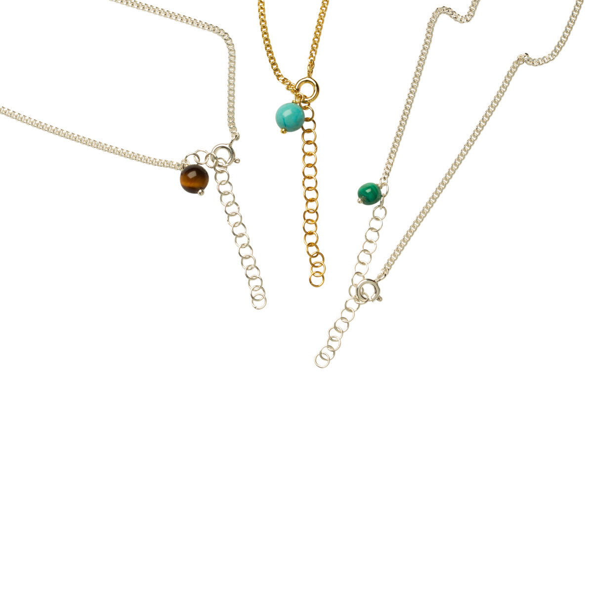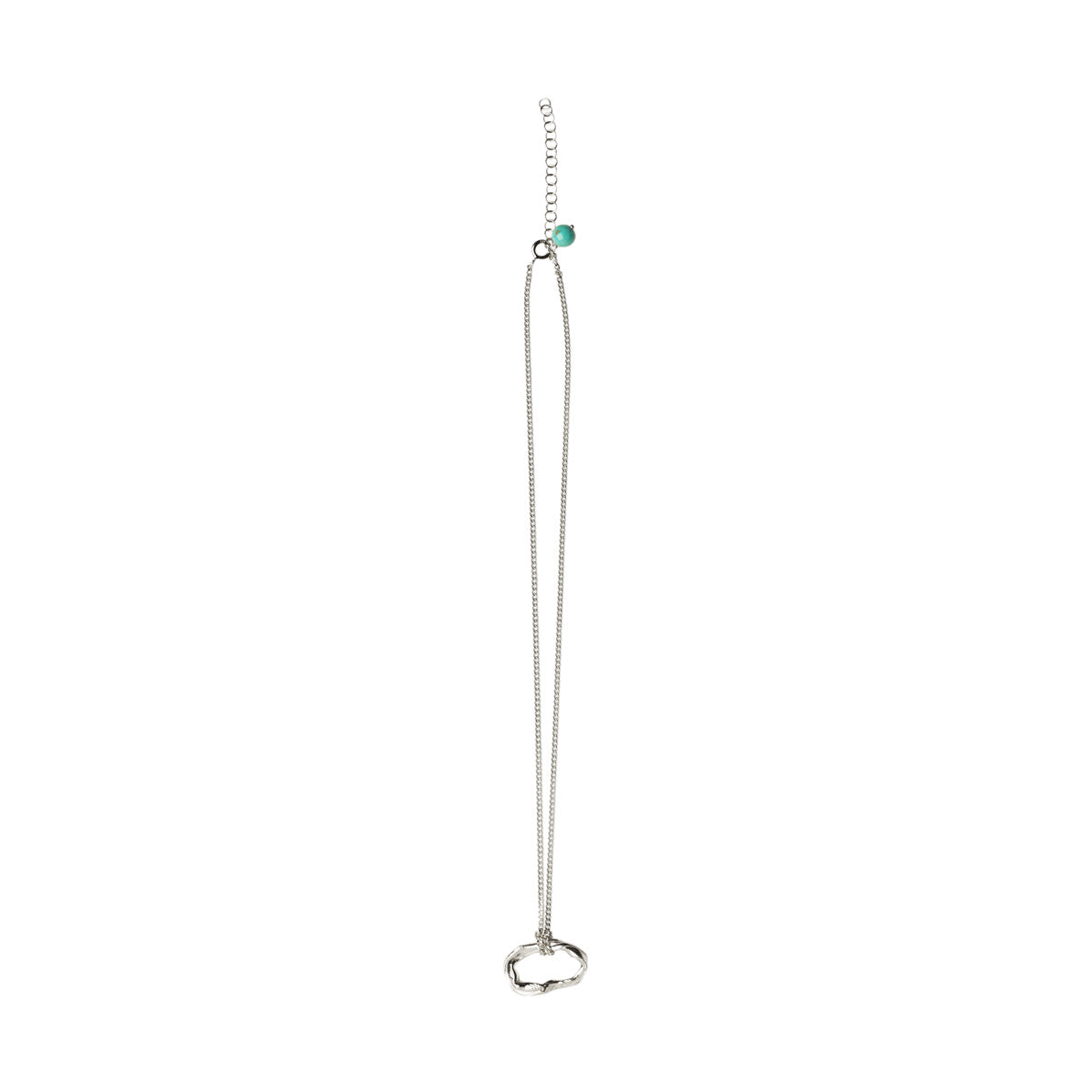 This cool necklace made from recycled silver at our studio in Copenhagen, has an adjustable length and is adorned with a large handcrafted ring. The handcrafting leaves an intriguing interplay between a smooth polished surface and rougher parts with cracks and fingerprints. The length can be adjusted from choker size to a looser version depending on mood and neck-size with an extension chain attached with a semi-precious bead - choose from turquois, coral, malachite or tigers eye.