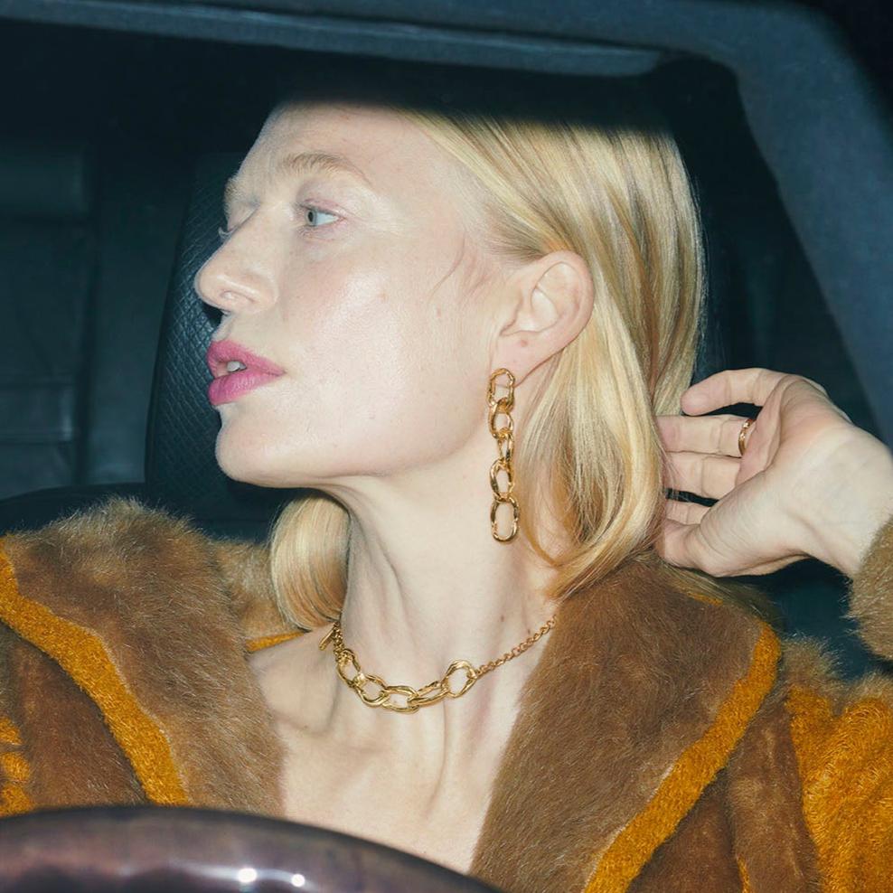 This handcrafted necklace in recycled silver, is made at our workshop in Copenhagen, and can be adjusted from choker size to a looser version depending on mood and neck-size. The look of this necklace is both raw and refined at the same time, with an elegant center of 5 organic rings ending in an equally organic looking bridle lock. Each link is handcrafted in wax before cast in silver, which leaves all rings unique, and with an intriguing interplay between a smooth polished surface and rougher parts with cracks and fingerprints.